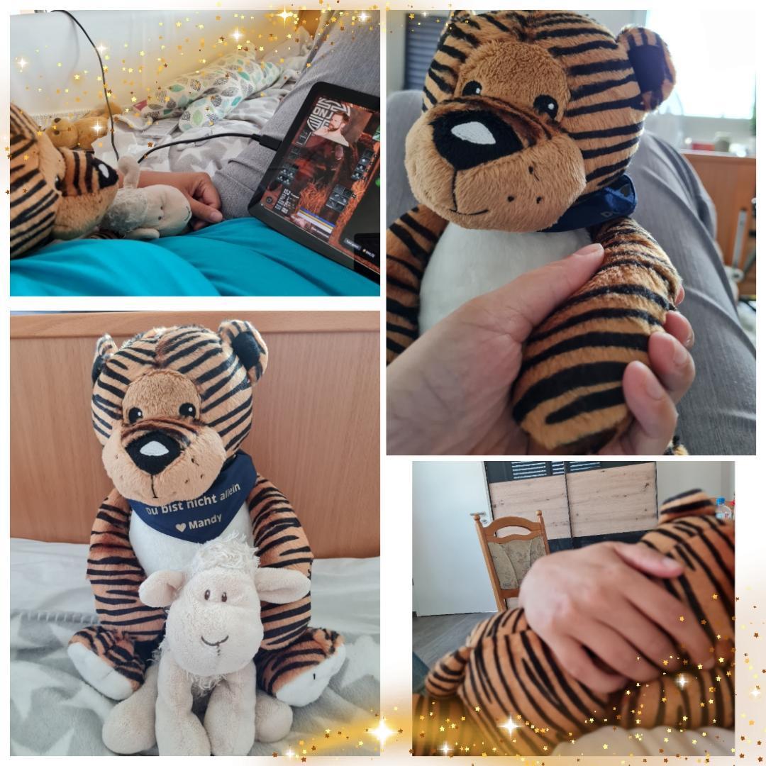 "Heute durfte ich meinen Trost-Tiger zum ersten Mal in den Arm nehmen. Er ist so toll und geht bald mit auf meine Reise zur Reha zur besseren Trauerbewätltigung.