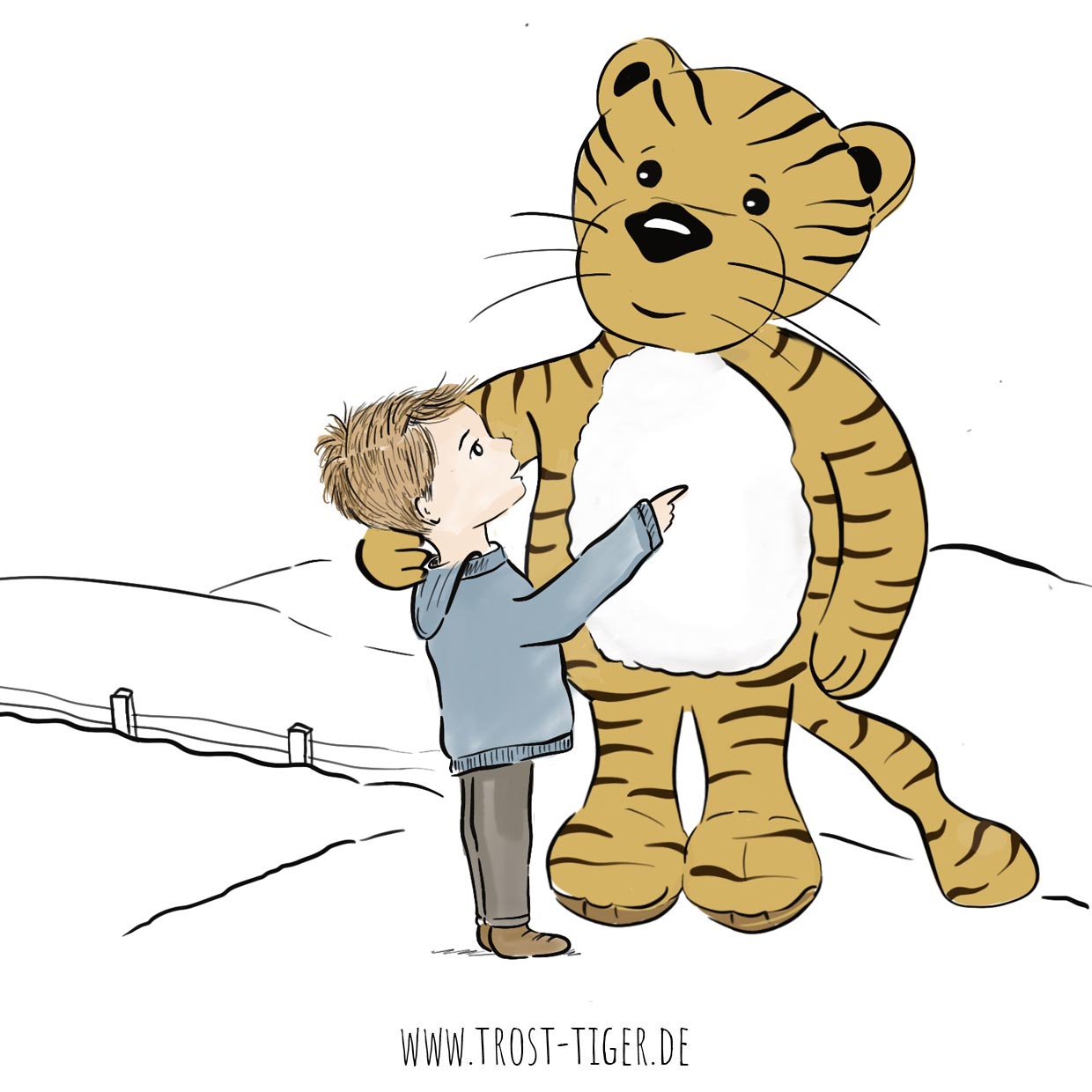 „Hallo, kannst Du mir helfen? Da wo mein Herz sitzt, tut es ganz schön weh!“, sagte der kleine Junge Tino zum Trost-Tiger. „Ich kann dir deinen Schmerz leider nicht abnehmen. Aber ich halte ihn mit dir aus!“, sagte der Trost-Tiger.