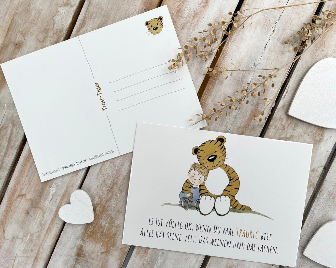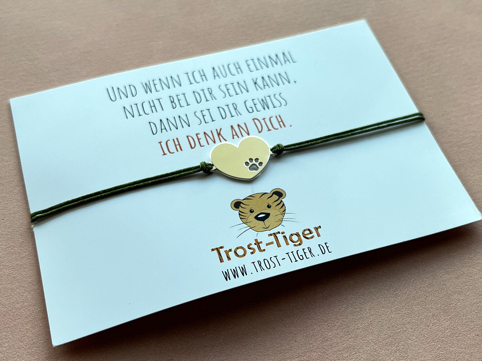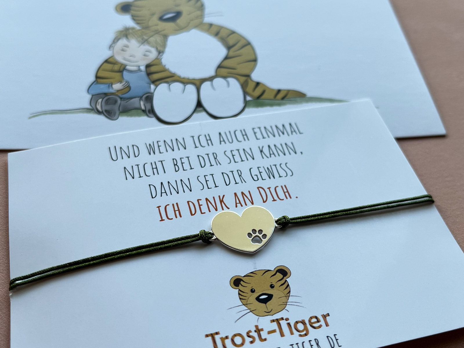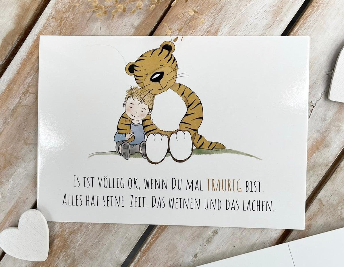 Das Armband wird auf einer kleinen Schmuckkarte mit Trost Tiger Zitat verschickt und mit einer hochwertigen Hochglanz-UV-Lack Postkarte. Diese hat eine Größe von 14,8 cm x 10,5 cm (DIN A6) ist auf der Rückseite beschreibbar und wurde auf 0,46 mm starken Postkarten-Chromokarton 300g gedruckt.